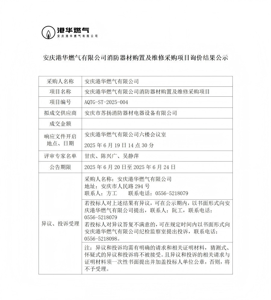 安慶港華燃氣有限公司消防器材購置及維修采購項目詢價結(jié)果公示