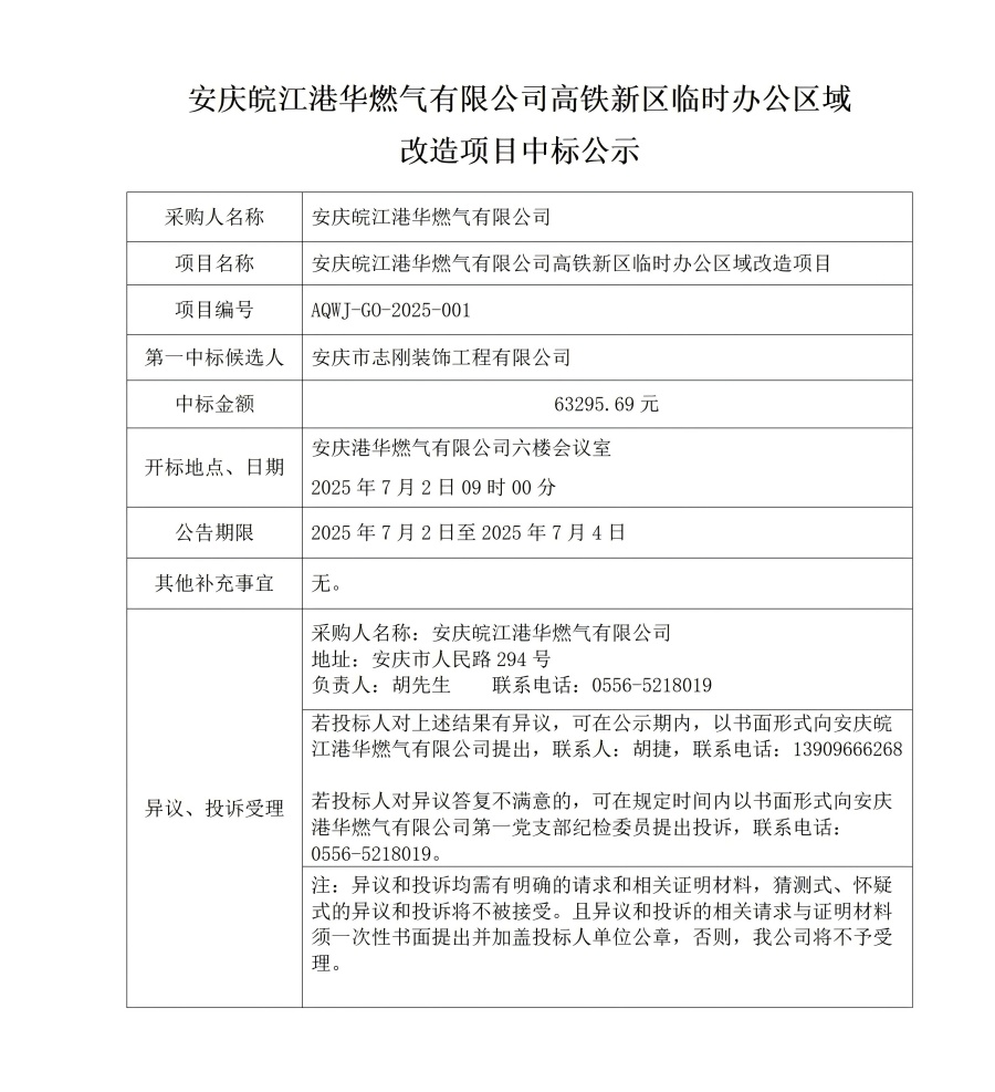 安慶皖江港華燃?xì)庥邢薰靖哞F新區(qū)臨時(shí)辦公區(qū)域改造項(xiàng)目中標(biāo)公示