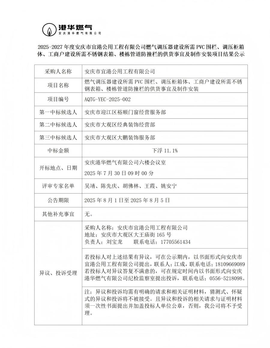 2025-2027年度安慶市宜港公用工程有限公司燃氣調壓器建設所需PVC圍欄、調壓柜箱體、工商戶建設所需不銹鋼表箱、樓棟管道防撞欄的供貨事宜及制作安裝項目結果公示