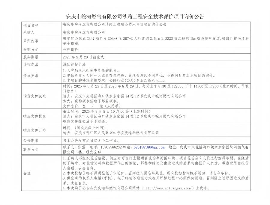 安慶市皖河燃氣有限公司涉路工程安全技術評價項目詢價公告
