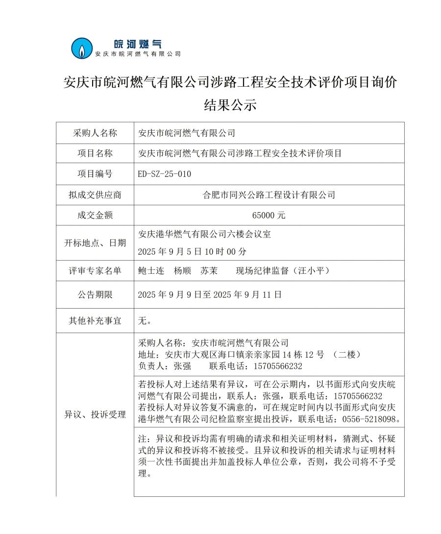 安慶市皖河燃?xì)庥邢薰旧媛饭こ贪踩夹g(shù)評價(jià)項(xiàng)目詢價(jià)結(jié)果公示